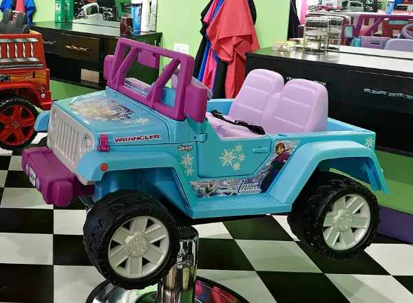 Why sit in a just a regular styling chair? At Sharkey's kids can sit in their choice of a fun car! Including a Fire Truck, Green Rescue Truck, Frozen Jeep or Disney Princess, Police Car, and more! (cars vary per location)